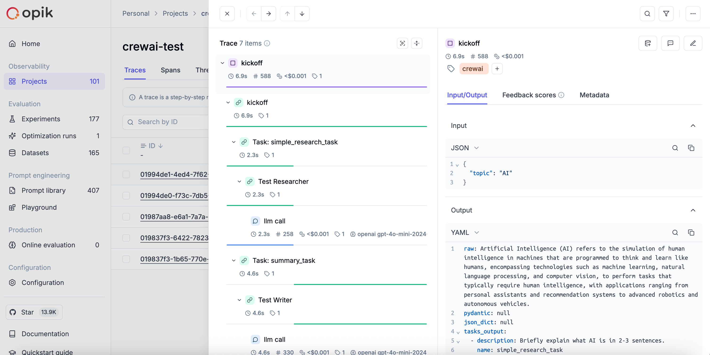 Opik integrates with CrewAI to log traces for all CrewAI activity, including both classic Crew/Agent/Task pipelines and the new CrewAI Flows API.
