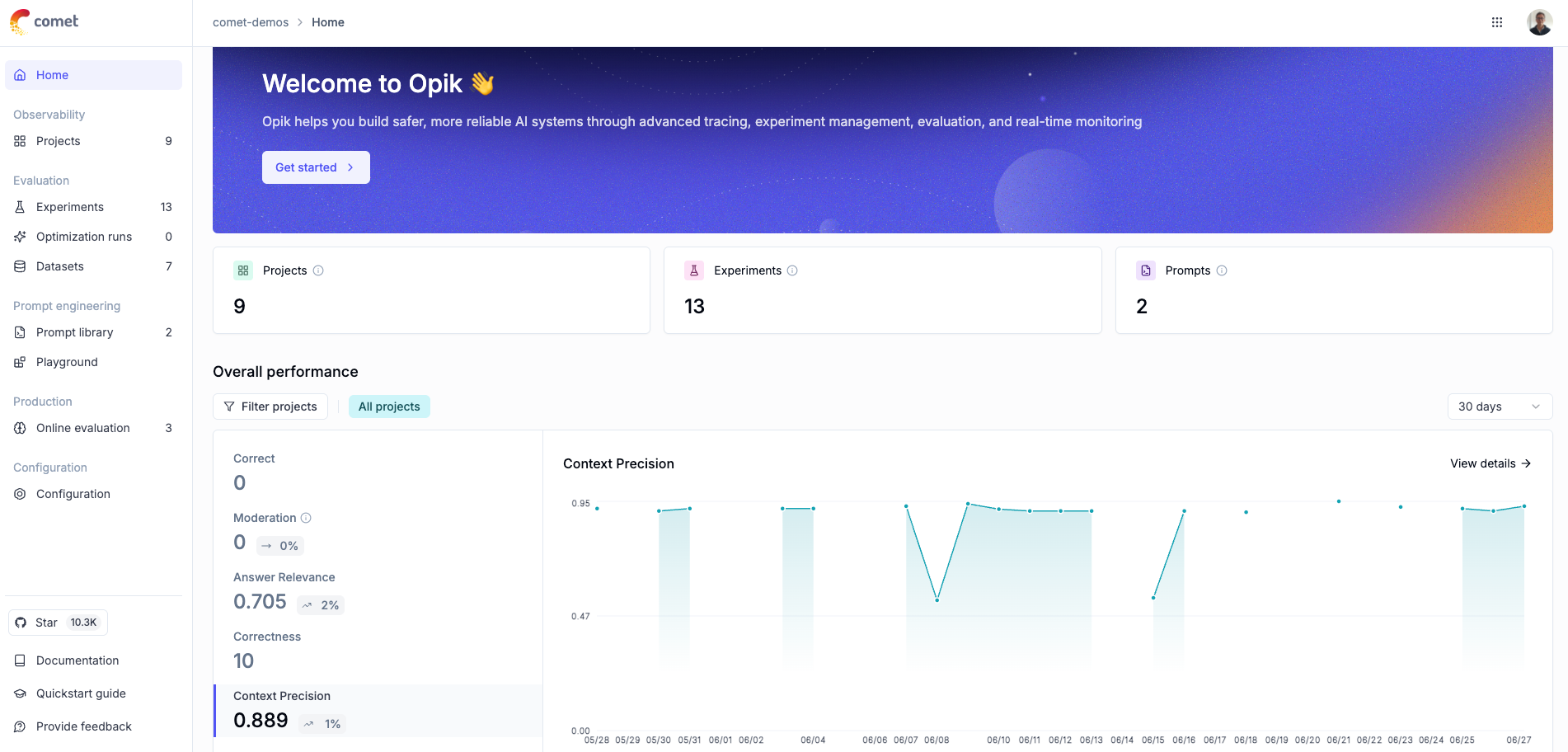 - We’ve redesigned the Opik Home Page to deliver a cleaner, more intuitive first-use experience, with a focused value proposition, direct access to key metrics, and a polished look. The demo data has also been upgraded to showcase Opik’s capabilities more effectively for new users. Additionally, we’ve added inter-project comparison capabilities for metrics and cost control, allowing you to benchmark and monitor performance and expenses across multiple projects.