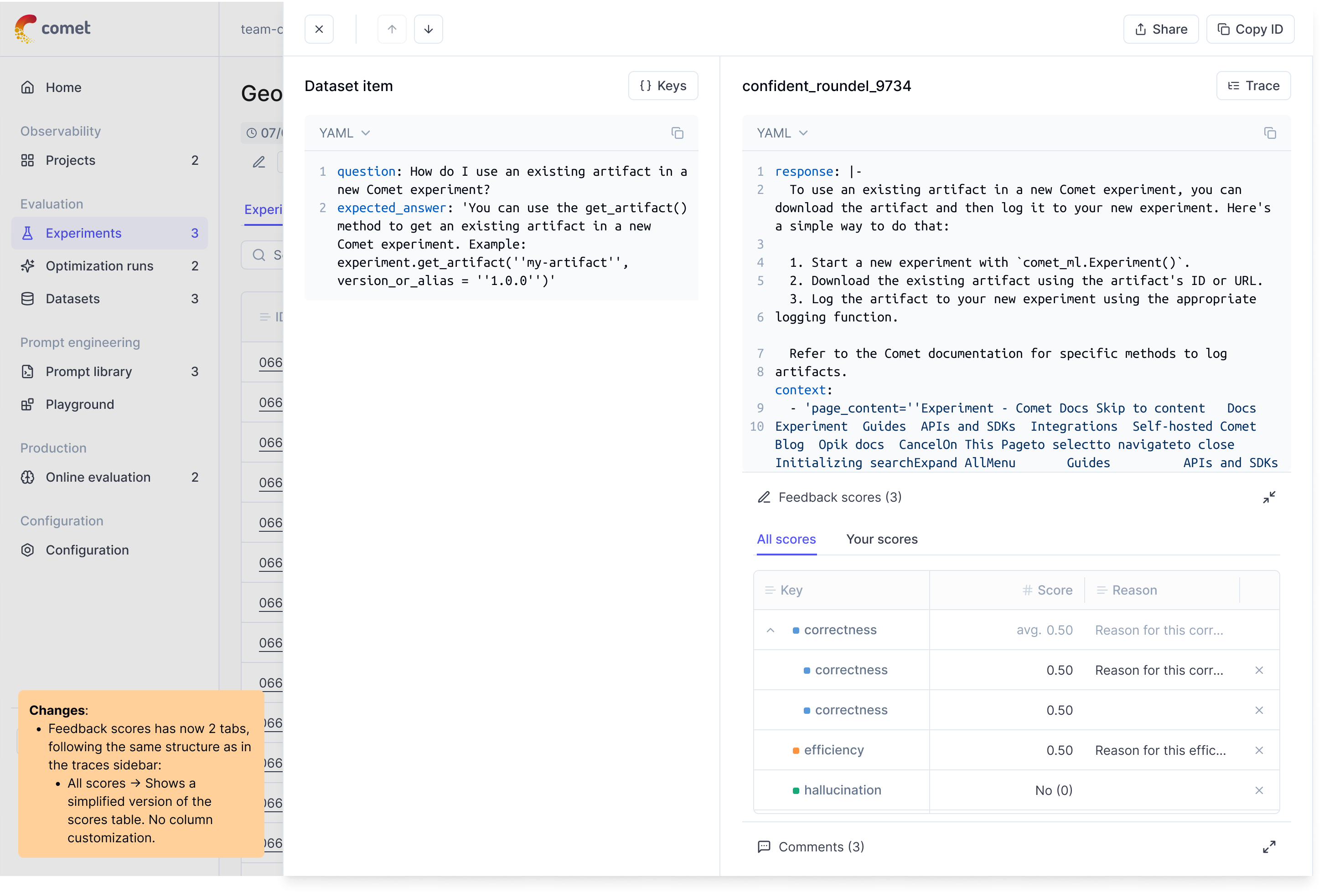 One of the main advantages of having an automated evaluation platform is the ability to iterate quickly. The main drawback is that it can become difficult to track what has changed between two different iterations of an experiment.