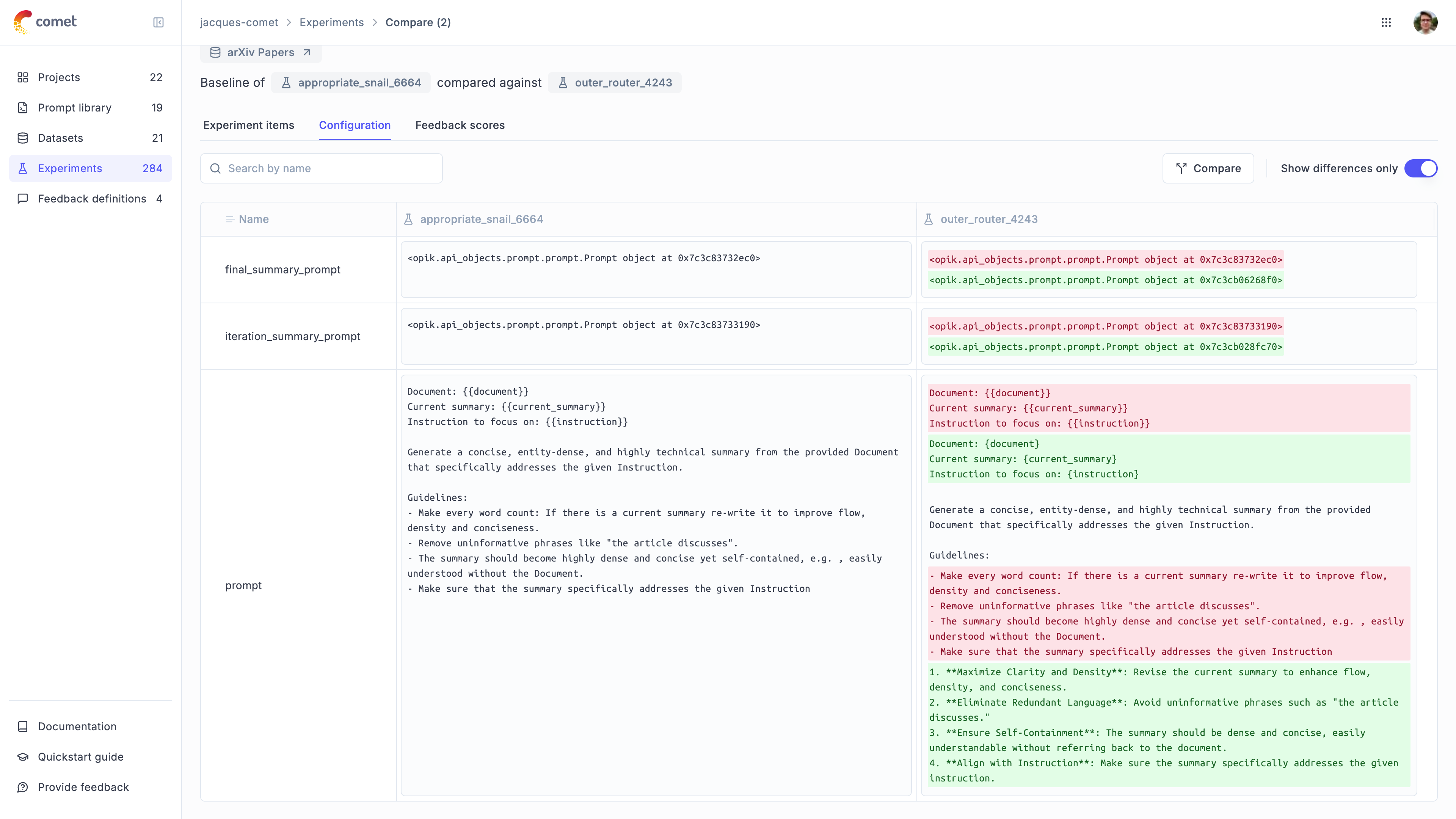 You can then compare the configuration of two different experiments from the Opik UI to see what has changed.