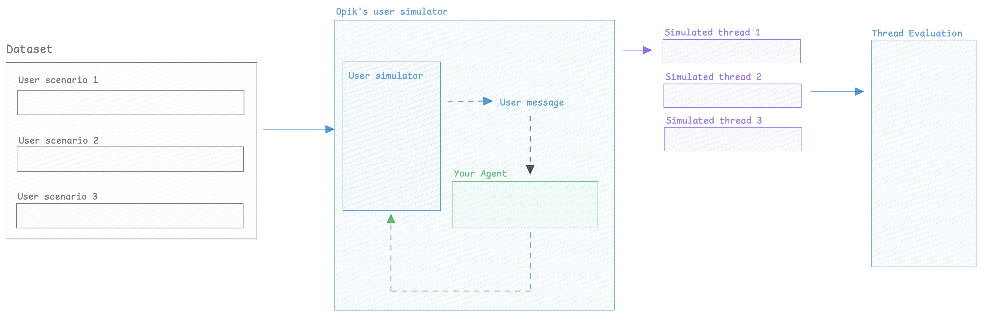 To solve this, we can use an LLM to simulate the user — generating realistic follow-up messages based on the conversation so far and running this for a configurable number of turns.