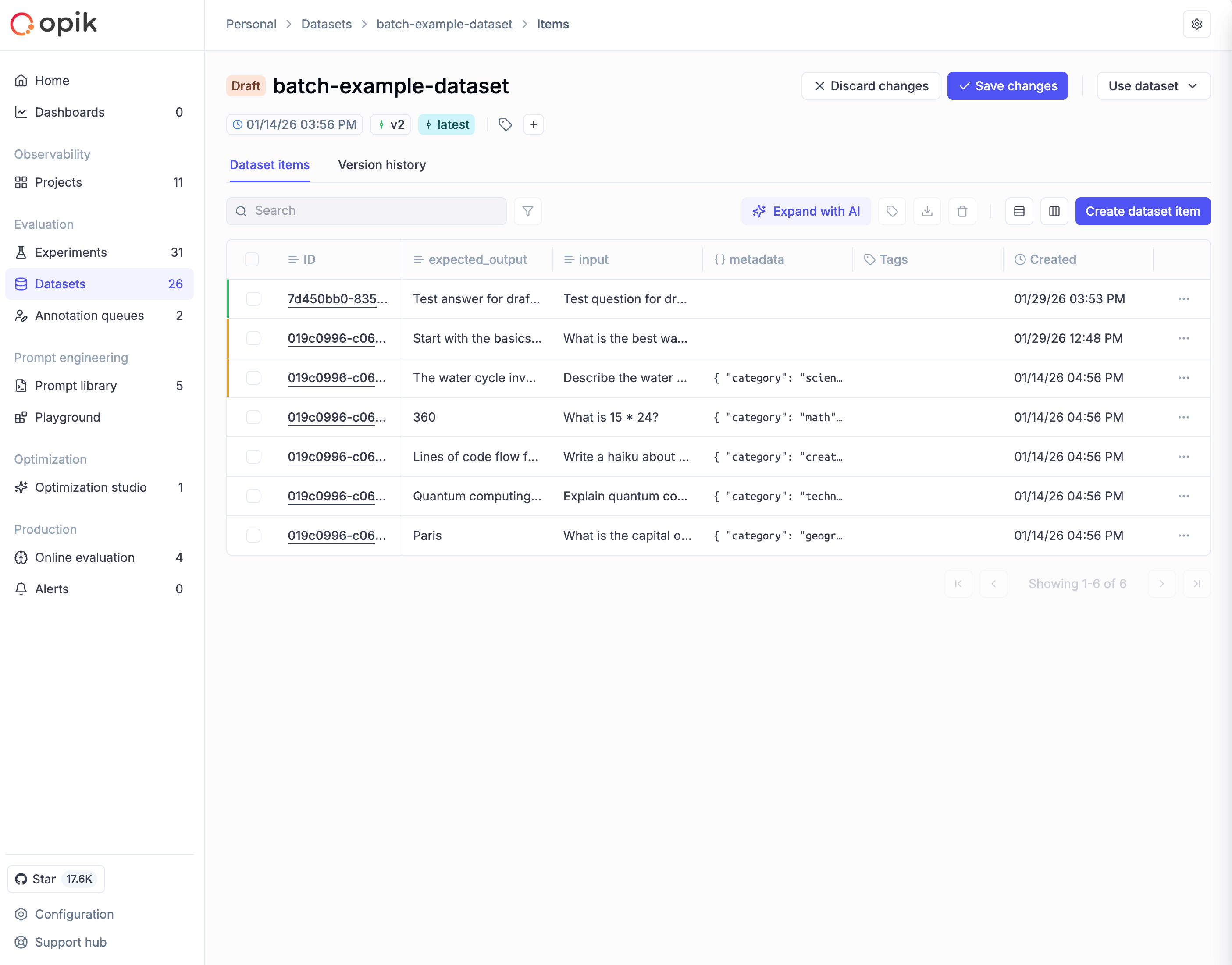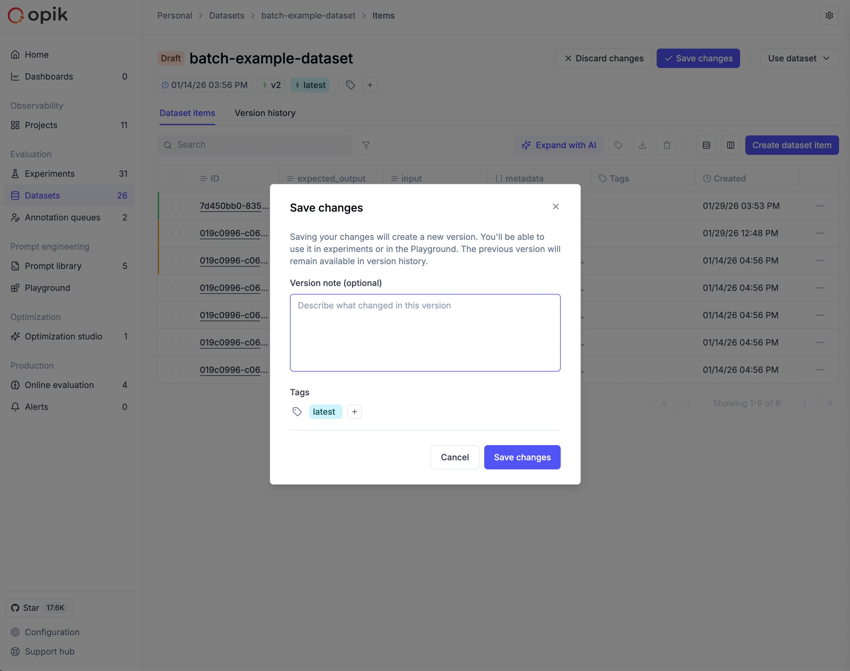 When making changes to a dataset in the Opik UI, all modifications go into a draft state first. This gives you a staging area to review changes before committing them as a new version. The draft is visible only to you, and AI-generated samples from “Expand with AI” also go to draft for review.