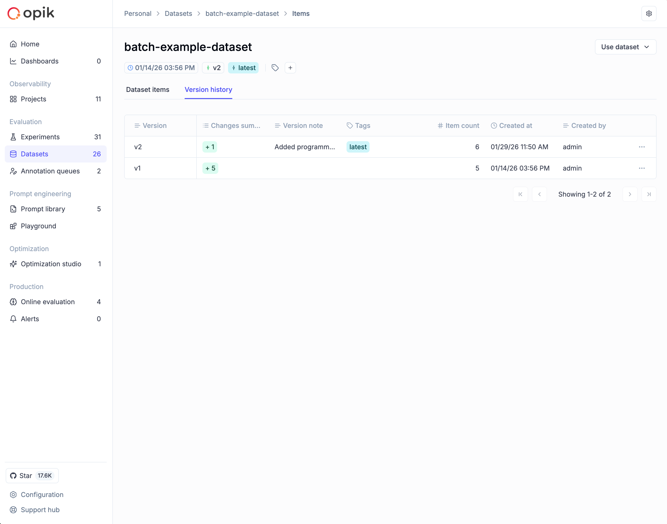 To view the complete timeline of dataset changes, navigate to your dataset and click the Version history tab. The table shows each version’s name, change summary (items added/modified/deleted), version note, tags, item count, and creation timestamp.