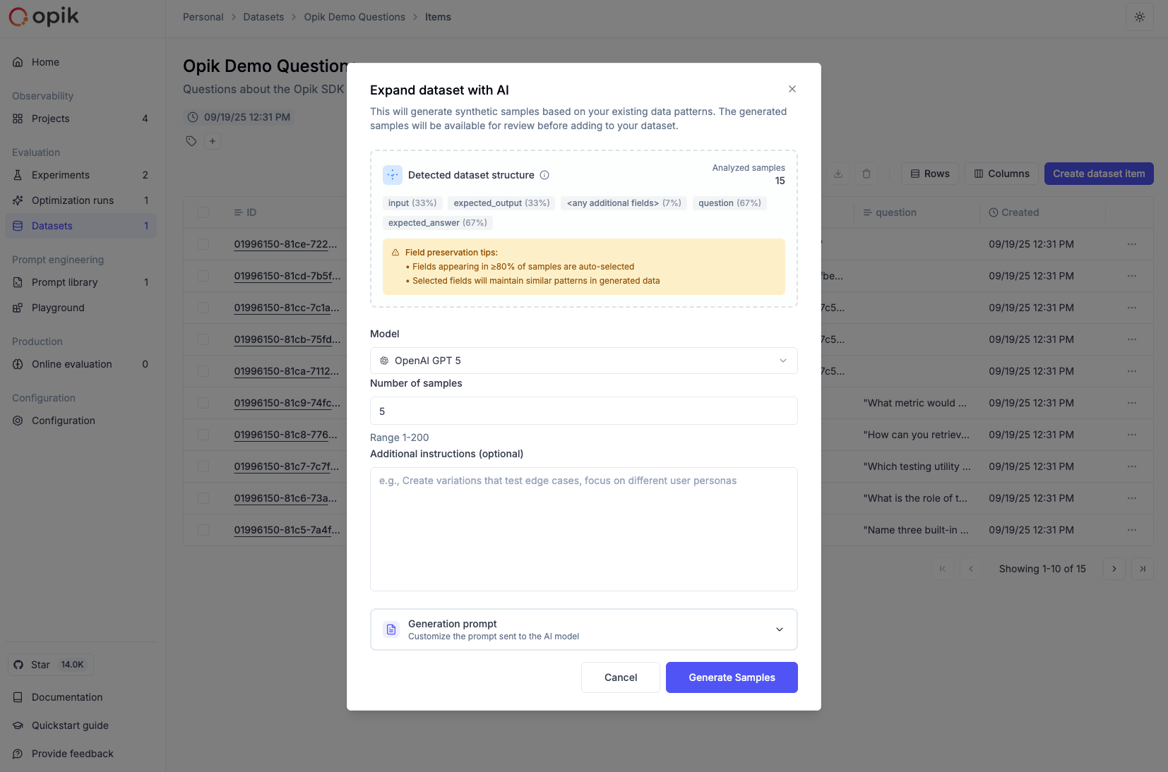 Preserve Fields: Use this to maintain consistency in certain fields while allowing variation in others. For example, preserve the category field while varying the input and expected_output.