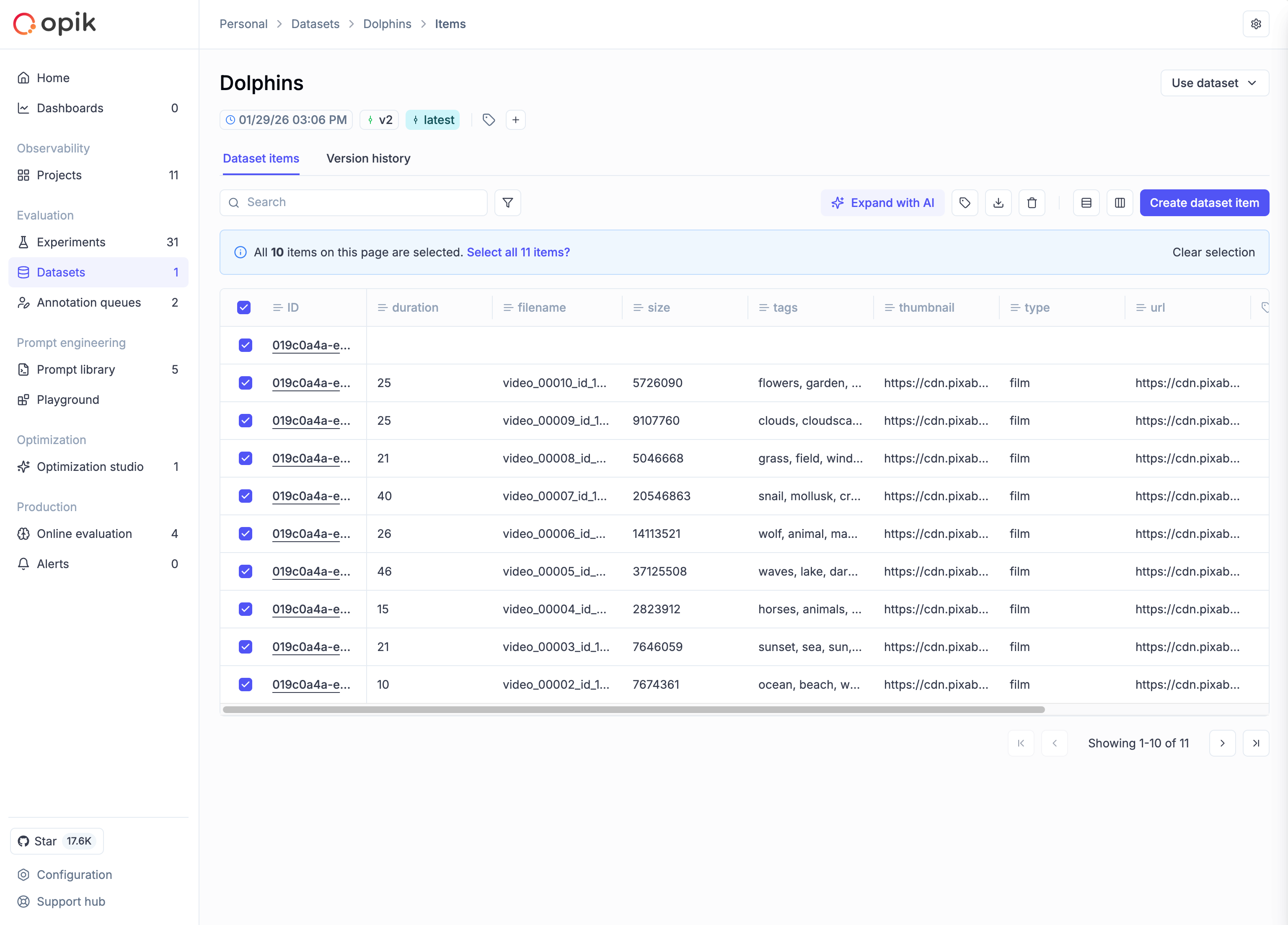 - Navigate to your dataset in the Opik UI