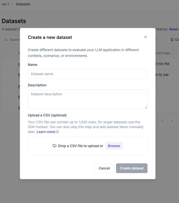 The simplest and fastest way to create a dataset is directly in the Opik UI. This is ideal for quickly bootstrapping datasets from CSV files without needing to write any code.