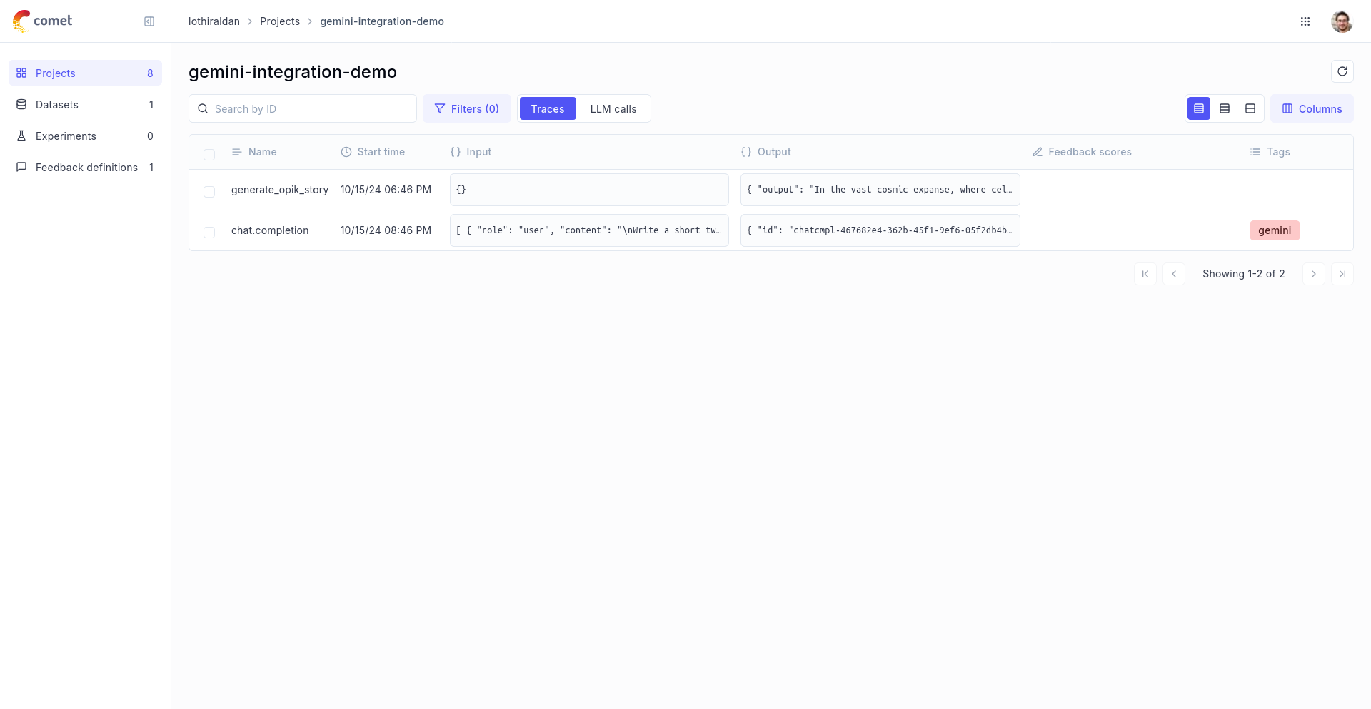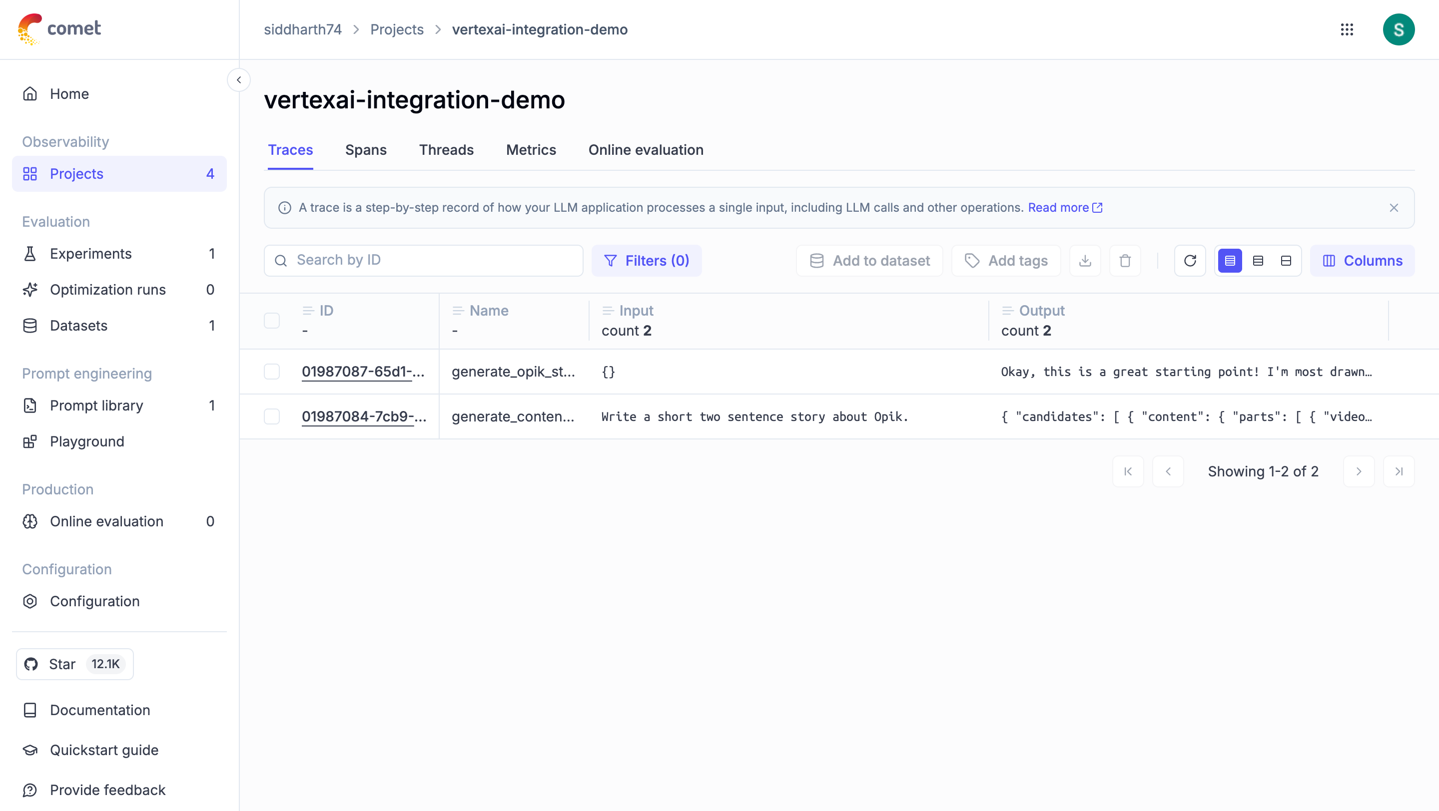 Opik also supports Google VertexAI, Google’s fully-managed AI development platform that provides access to Gemini models through the google-genai package. When using VertexAI, you can leverage the same track_genai wrapper with the google-genai client configured for VertexAI, allowing you to trace and monitor your Gemini model calls whether you’re using the direct Google AI API or through VertexAI’s enterprise platform.