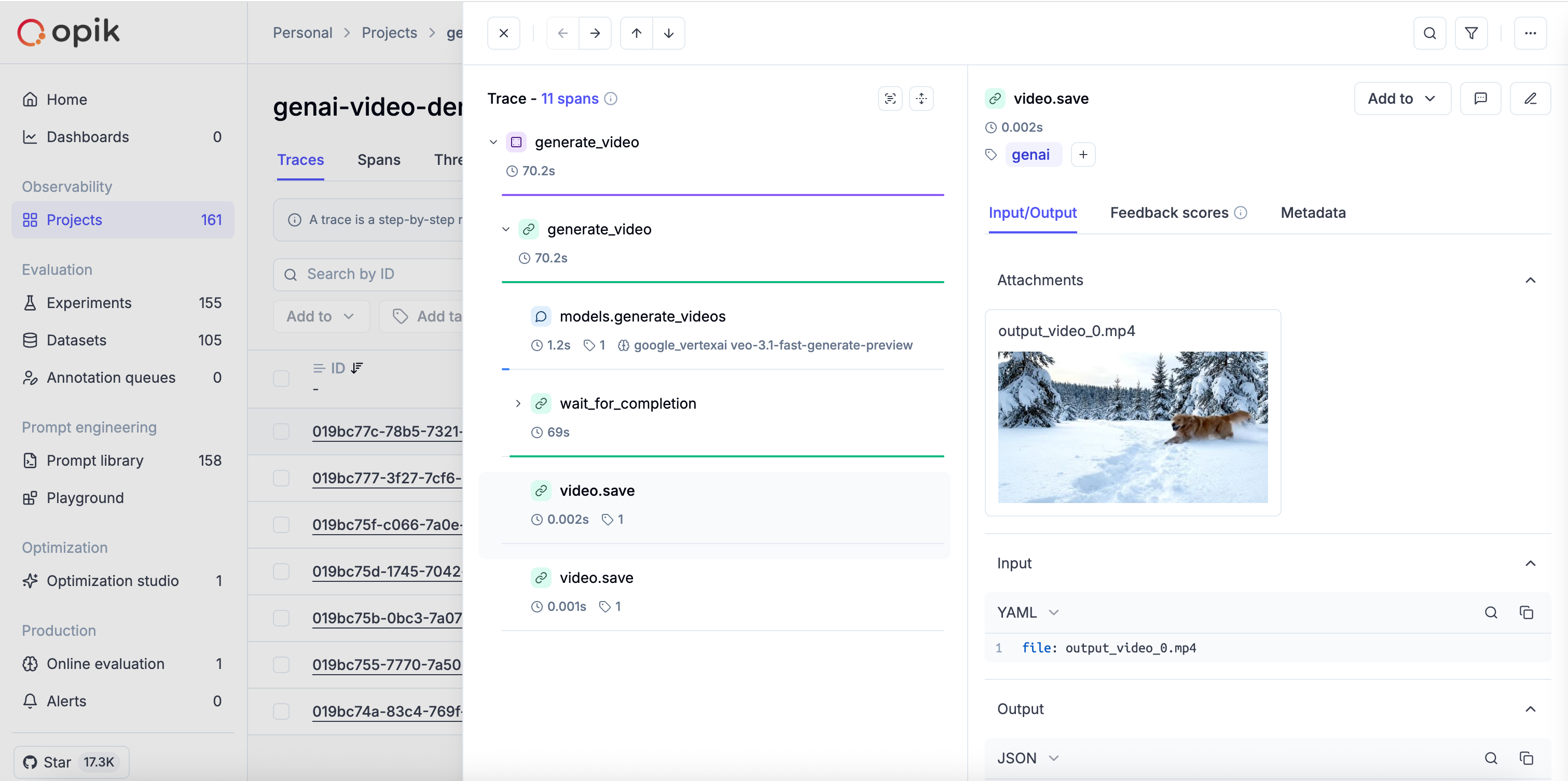 The track_genai wrapper also supports Google’s Veo video generation API. When you generate videos, Opik automatically tracks the video creation process and logs the generated video as an attachment when you save it.