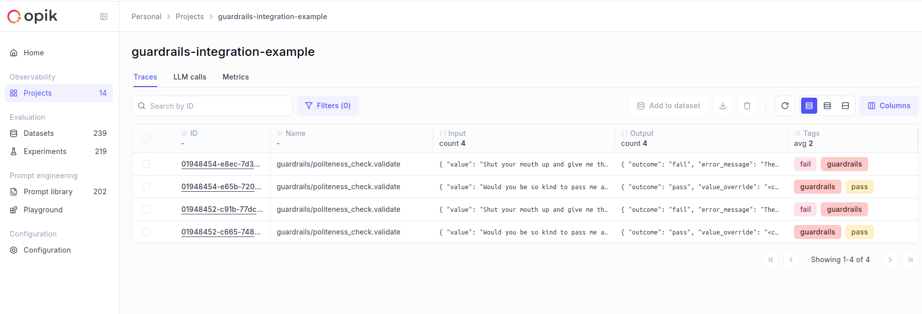 For this guide we will use a simple example that logs guardrails validation steps as traces to Opik, providing them with the validation result tags.