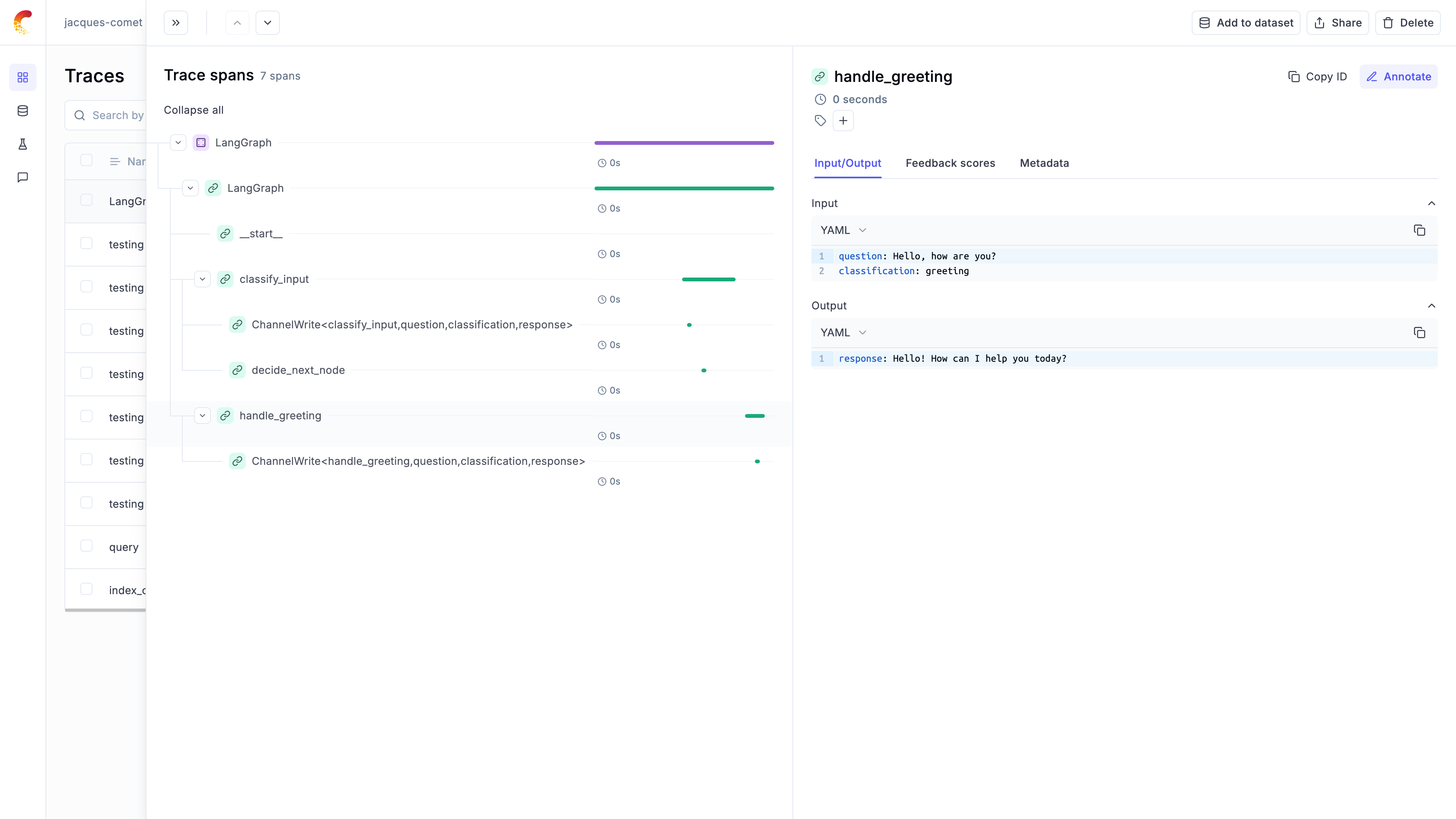 The graph execution is now logged on the Opik platform and can be viewed in the UI. The trace will show the complete execution path through the graph, including the classification decision and the chosen response path.