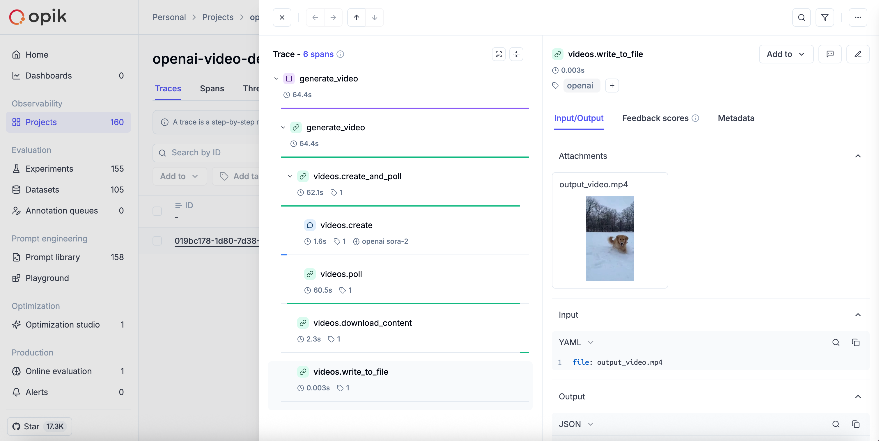 The track_openai wrapper also supports OpenAI’s video generation API (Sora). When you generate videos, Opik automatically tracks the video creation process and logs the generated video as an attachment when you download it via the client API.
