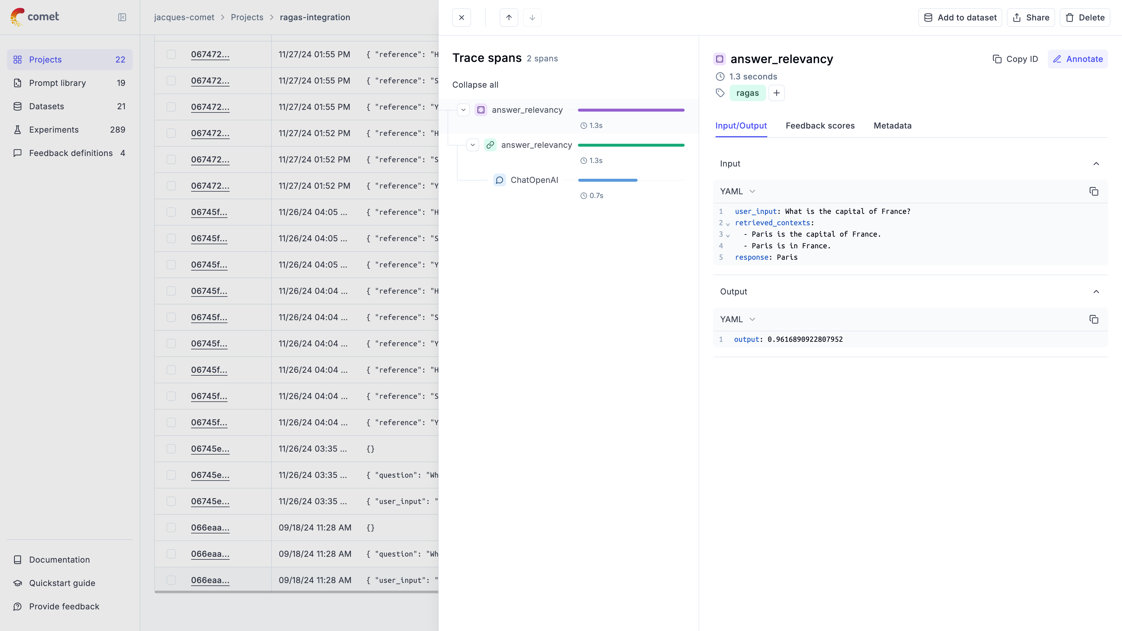 For more advanced use cases, you can evaluate entire datasets using Ragas metrics with the Opik evaluation platform: