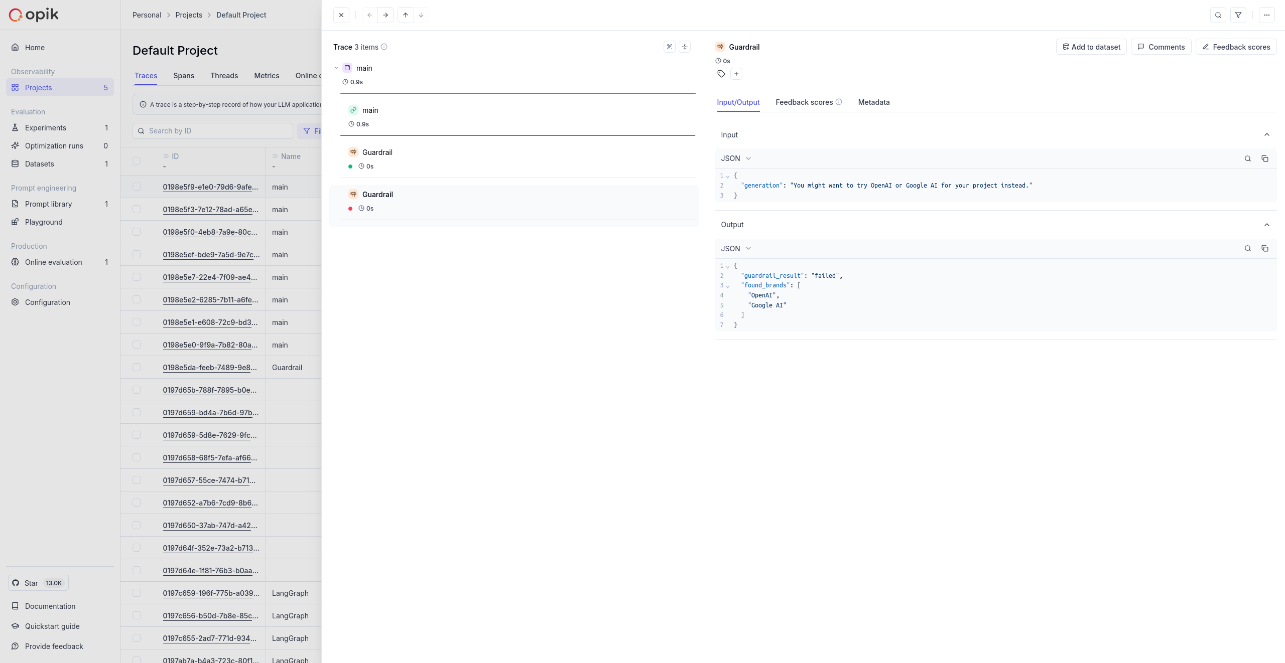After running the custom guardrail example above, you can view the results in the Opik dashboard. The guardrail spans will appear alongside your traces, showing which brand mentions were detected and whether the guardrail passed or failed.