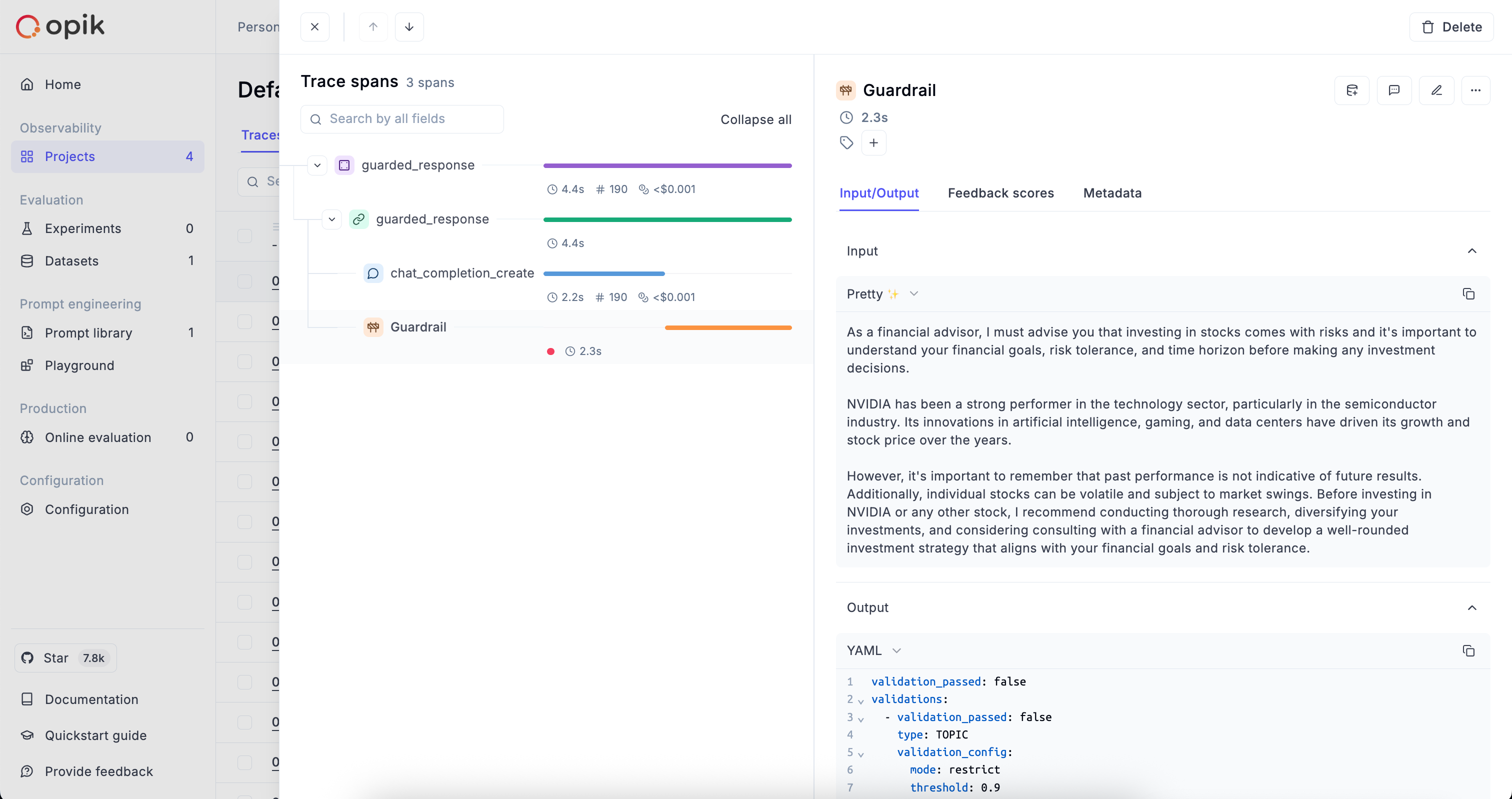 When a guardrail fails on an LLM call, Opik automatically adds the information to the trace. You can filter the traces in your project to only view those that have failed the guardrails.