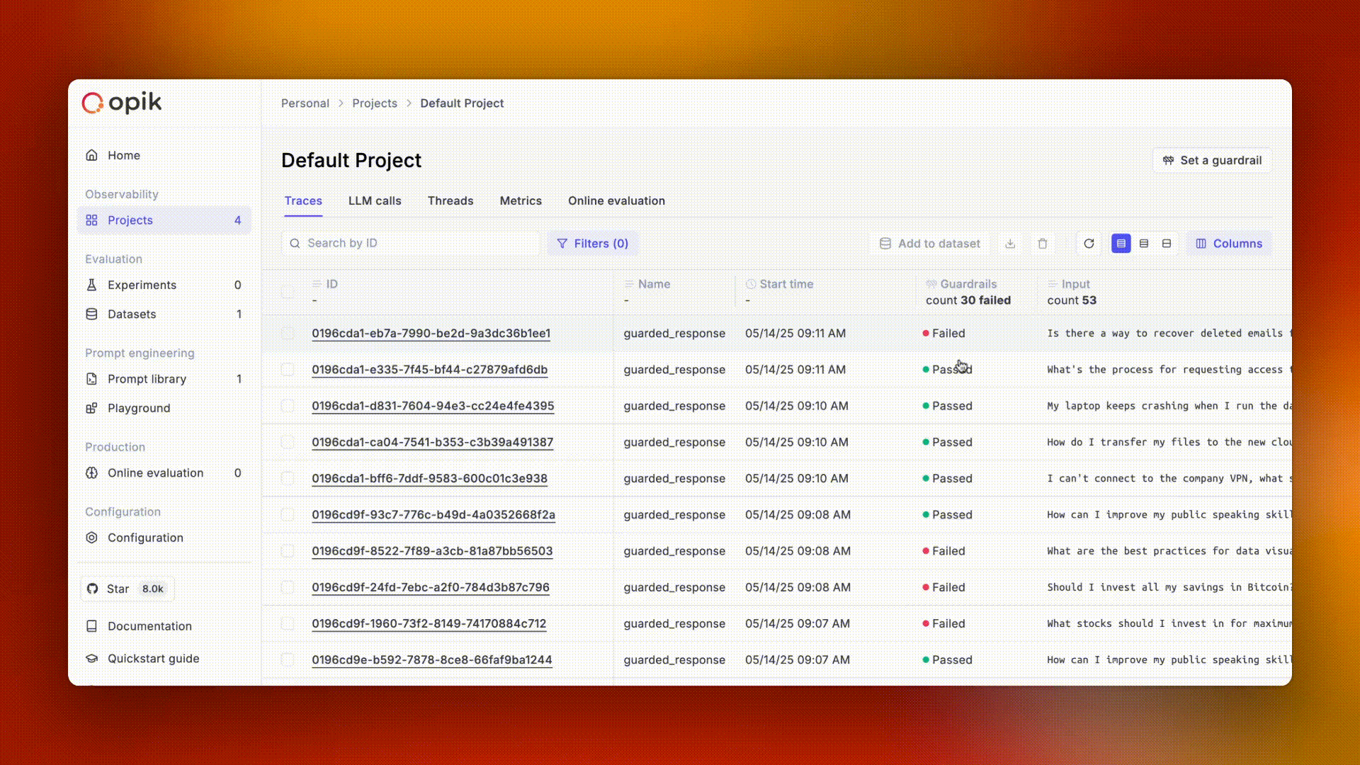 When a guardrail fails on an LLM call, Opik automatically adds the information to the trace. You can filter the traces in your project to only view those that have failed the guardrails.