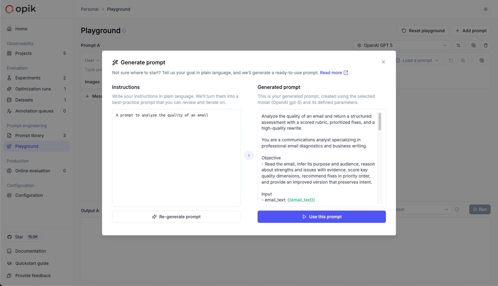 The Prompt Generator creates a complete, well-structured prompt from a simple task description. Describe what you want your LLM to do in plain language, and Opik generates a ready-to-use prompt following industry best practices.
