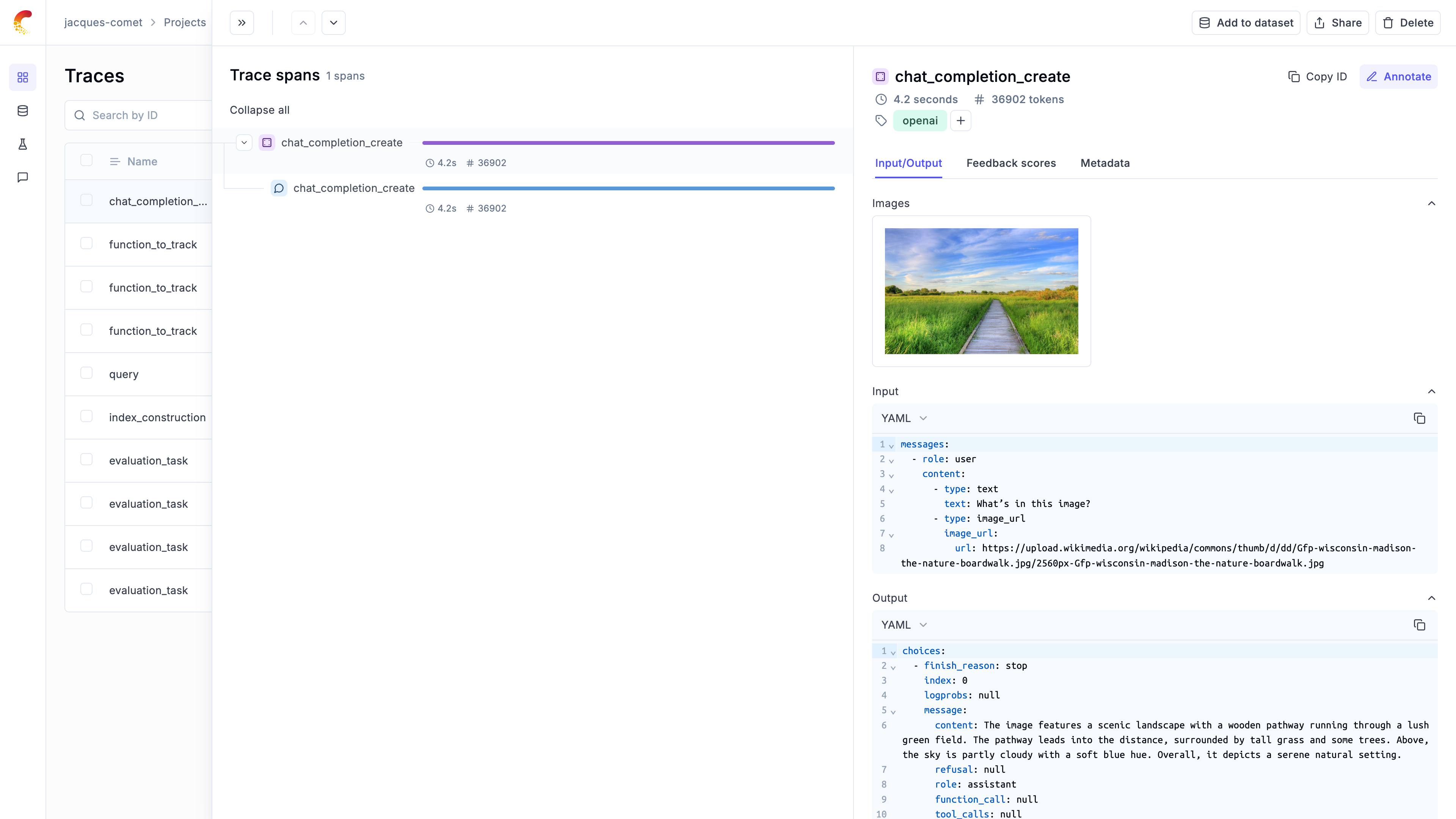 Opik supports multimodal traces allowing you to track not just the text input and output of your LLM, but also images, videos and audio and any other media.