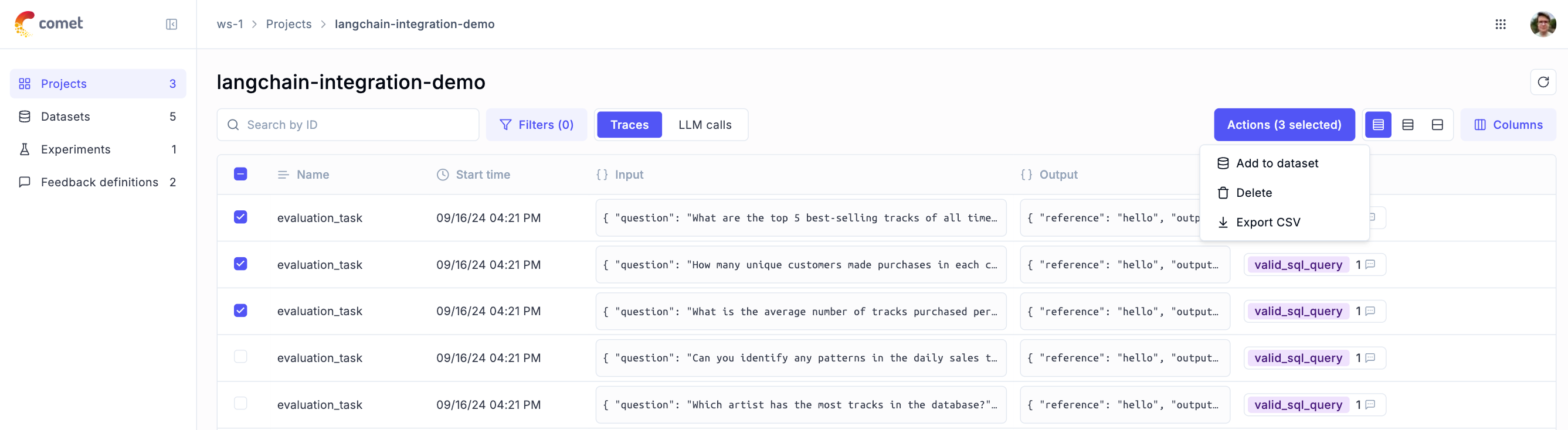 inputandexpected_output. See more in the SDK section below. - Multiple small UX improvements (more informative empty state for projects, updated icons, feedback tab in the experiment page, etc).