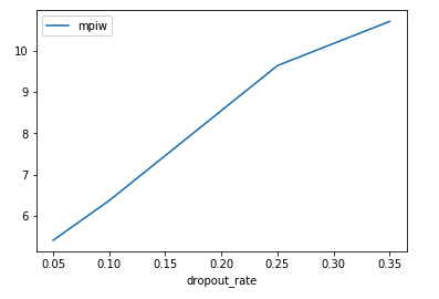 So in our case, increasing our dropout rate causes an increase in both PICP and MPIW. This does intuitively make sense. The large the number of neurons being dropped out of the network, the higher the variance in the output. This would lead to larger average intervals that would capture our target value.
