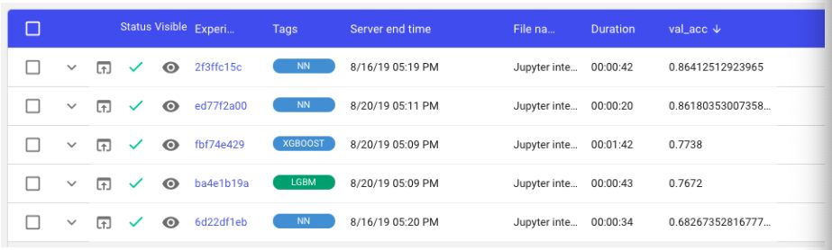 Comparing our models using Comet’s project view, we can see that our Neural Network models are outperforming the XGBoost and LGBM experiments by a considerable margin.