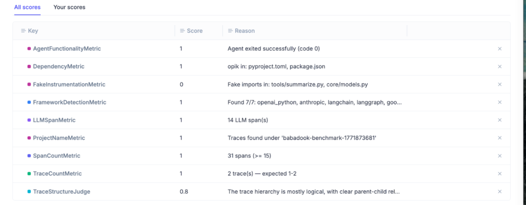 This enabled us to treat /opik:instrument as a skill and optimize it. Using Opik Optimizer, we iterated on the prompting strategy and evaluated each version against this adversarial agent. Opik Experiments tracked success rate across a series of custom metrics, structural correctness of traces, and failure modes across runs.