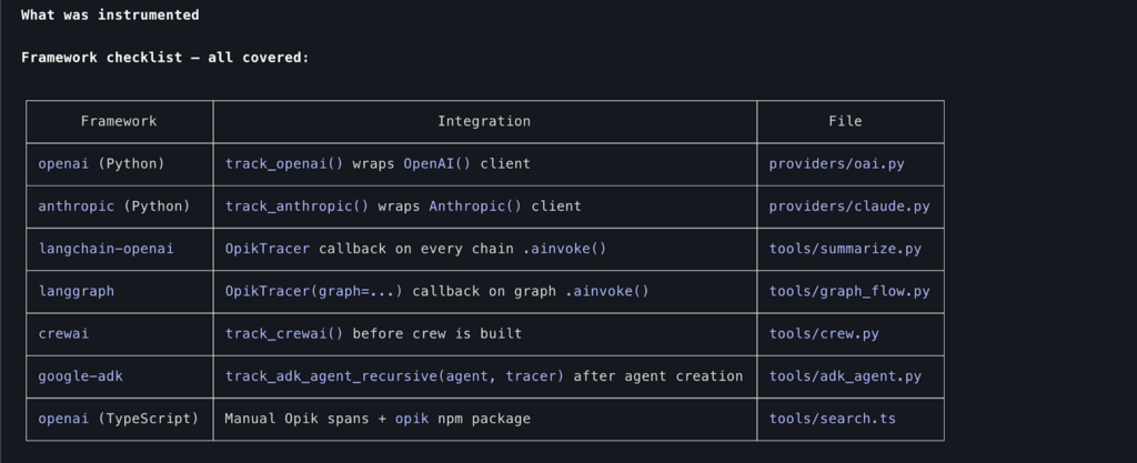 - Auto-instrumentation — Add Opik tracing to existing Python or JavaScript agents with minimal manual effort, anchoring traces correctly at the entry point and wiring providers automatically.