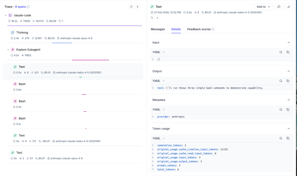 Each Claude Code turn becomes an Opik trace. Tool calls and responses become spans. Subagent invocations are nested under their parent task span. You can see what Claude did, in what order, and what it produced at each step, instead of treating the agent as a black box.