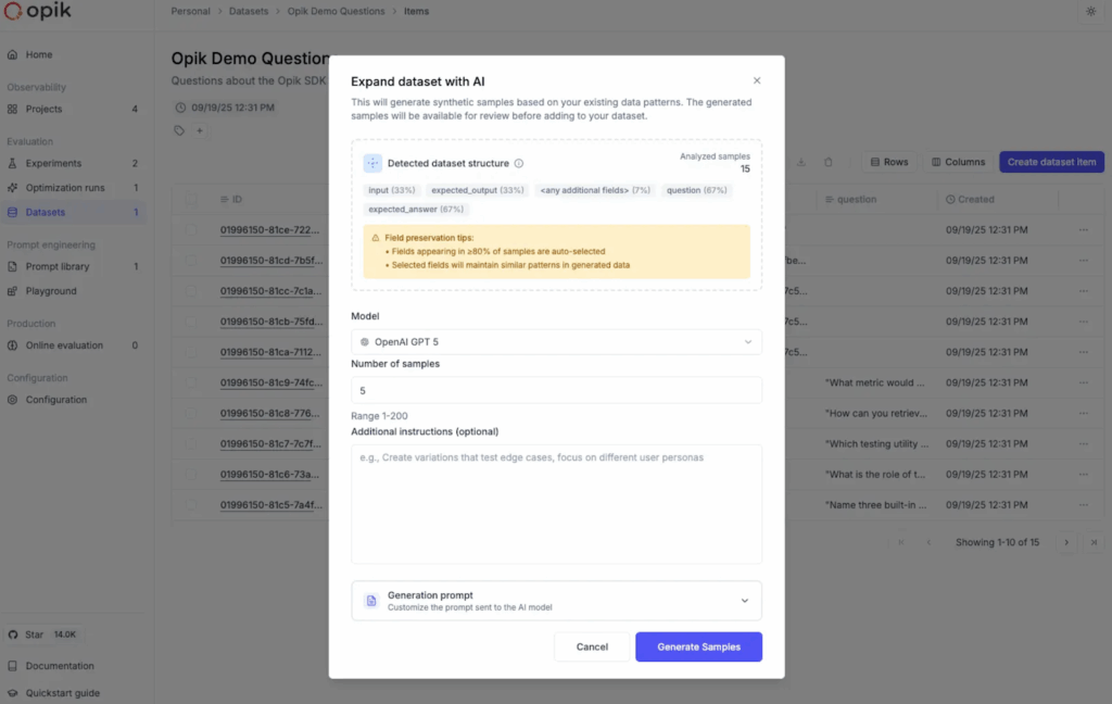 To run effective evaluations and accurately score an LLM application’s performance, you need a wide range of test data. Opik’s new AI-powered data expansion automates dataset creation, analyzing your existing datasets to generate additional test cases, edge cases, and evaluation scenarios. This results in more intelligent variations that expand coverage and relevance, allowing you to build more robust evaluation suites without manual overhead.