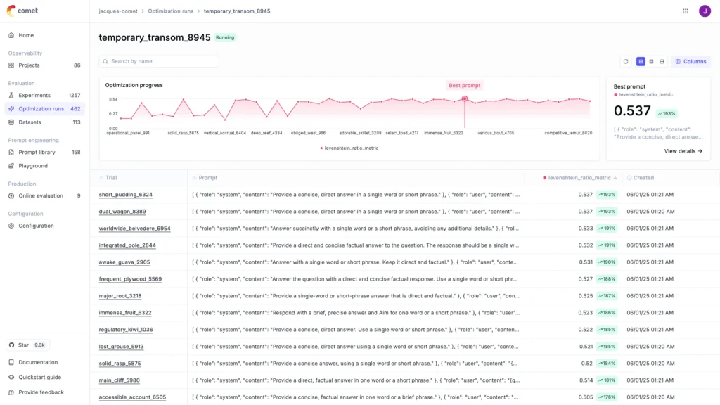 There’s no single optimization algorithm or configuration that works for every use case. A simple chatbot answering general FAQs has different needs than a multi-agent system orchestrating financial transactions. Comet is designing agent optimization as a flexible to work with a variety of our optimizers and public open-source optimizers rather than a one-size-fits-all tool. Developers can bring in any optimization algorithm, choose the metrics that matter for their use case, and select which variables to optimize based on their system’s complexity, lifecycle stage, and tolerance for failure. An early prototype might benefit from broad multi-prompt optimization, while a mature production system might run focused prompt tuning on a weekly schedule. The framework adapts to the situation rather than forcing developers into a prescribed approach.
