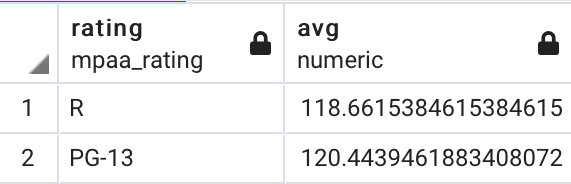 - AVG( ) & HAVING: After you have produced a grouped aggregate, we may add further conditions by using the HAVING operator. For instance, what MAAP rating categories, on average, contain films that are longer than 115 minutes?