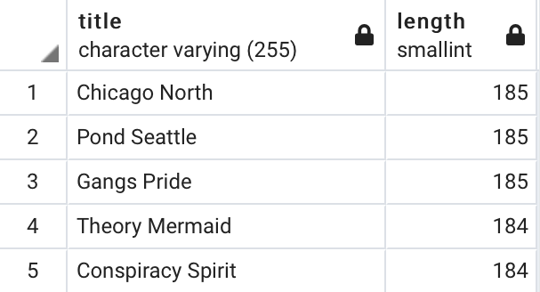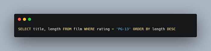 2. ORDER BY: We may sometimes better understand the data by sorting the returned result. What if we wanted the same list as before, but with PG-13 films arranged in length order from longest to shortest, and vice versa? With ORDER BY, this is simple to do: