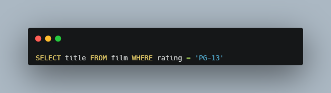 - WHERE: There are times when we only want to retrieve specific entries that meet certain criteria. Using the WHERE clause, we can specify conditions that must be met before returning the data. Essentially, we are filtering entries based on the condition. What if we only want to know about movies that are rated PG-13?