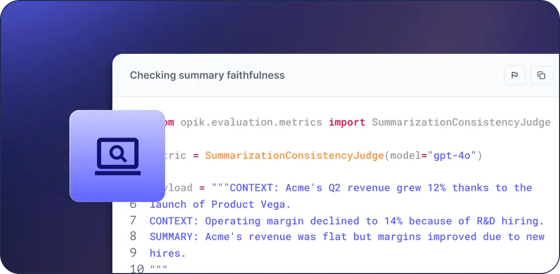 Ship AI features faster, with greater precision. Opik’s testing and evaluation toolset lends repeatable structure to your development cycles, reducing trial and error.