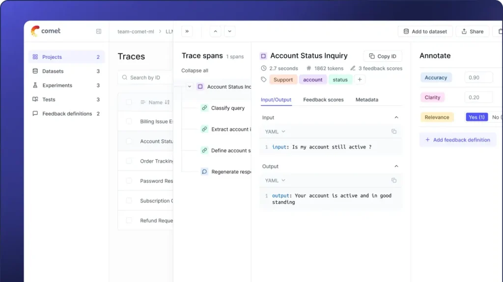 Opik runs on the Comet platform, certified in all relevant compliance frameworks and proven reliable in the world’s largest enterprise environments since 2017.